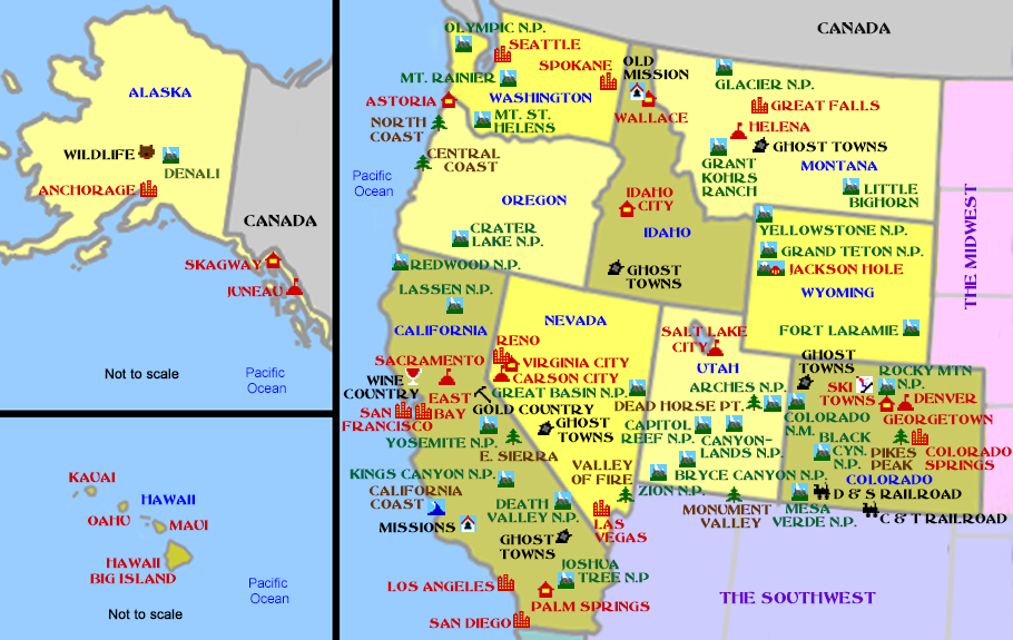 This is rugged territory with many active and extinct volcanoes. Huge mountain chains such as the Rockies, Sierra Nevada and Cascades that wend their way through these states creating a tremendous contrast to the flatness of neighbouring areas. The South West USA looks out to Latin America, the East to Europe and the Midwest looks out to, well, the Midwest. These western states are different not just because of their terrain but also because they are looking out firmly on to the vastness of the Pacific Ocean. This is partly geographic but also a question of heritage. Here the European and American Indian heritage found elsewhere in the USA is augmented by strong Asian, Polynesian and Russian influences.